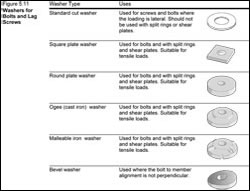 Washers are commonly used with bolts to keep the bolt head or nut from crushing the wood member when tightening is taking place. Washers are not required with a steel side plate, as the bolt head or nut bears directly on the steel. Common types of washers are shown in Figure 5.11 below.
